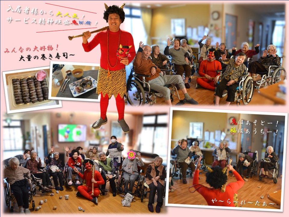 今年の3F南のお住まいは19名の入居者の方のなんと6名の方が年男・年女の午年生まれです。迎え撃つ鬼も3F南のスタッフで、2年ぶりの登場となる最強で気は優しくて力持ちの若手のホープ W君!皆さん縄文時代の狩猟・採集文化で培ったDNAを受け継いで笑顔の中に闘志を秘めて投げはなってみえました。
